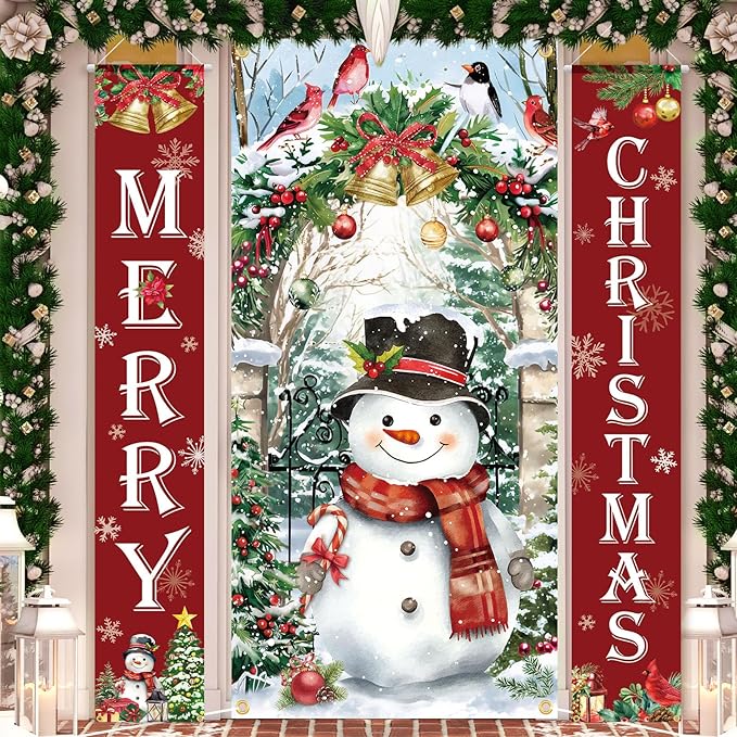 3 Pcs Christmas Door Cover Decoration Merry Christmas Door Banner Snowman Polyester Fabric Porch Banners Backdrop for Xmas Winter Outdoor Party Decor